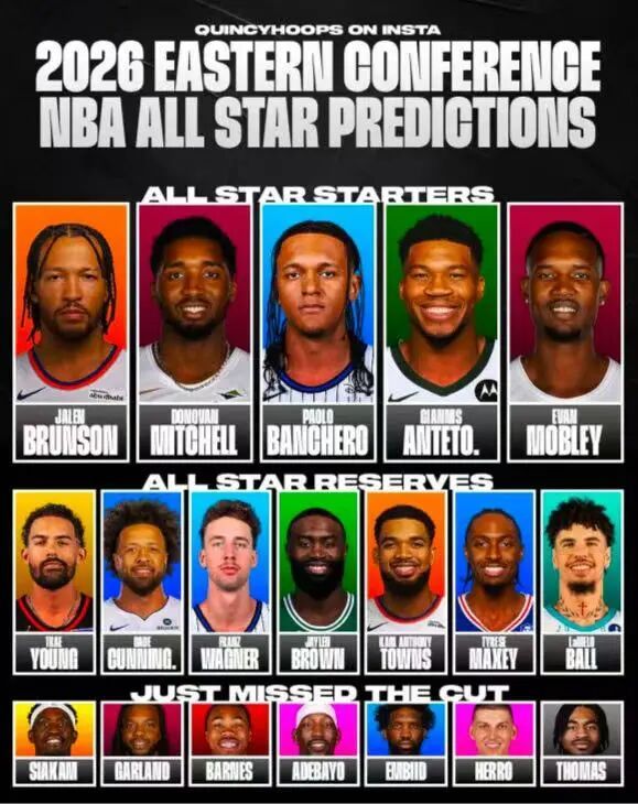 而且,在美媒Quincy Hoops预测的25-26赛季东西部全明星名单中,詹姆斯携手东契奇依旧首发!除了湖人双子星之外,亚历山大、文班和约基奇,而杜兰特与库里将以替补身份进入全明星。