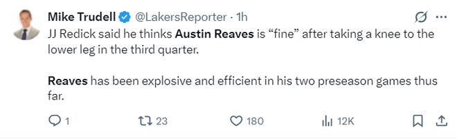 里夫斯目前已经确定会在湖人打先发,他这两场季前赛都非常高效,对阵太阳。21分钟,11中6,三分5中1,罚球7中7,拿到20分3篮板2助攻;对阵勇士23分钟,10中7,三分4中2,罚球6中5拿到21分3篮板3助攻1抢断1盖帽,两场比赛合计41分5助攻。