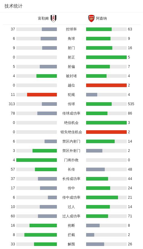 阿森纳1-0富勒姆全场数据:射正次数5-0,控球率超6成