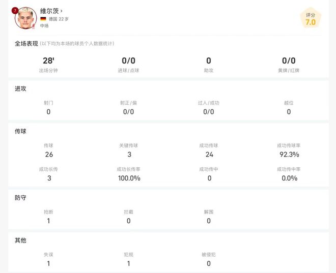 维尔茨双红会替补数据:全场0射门,传球成功率92.3%