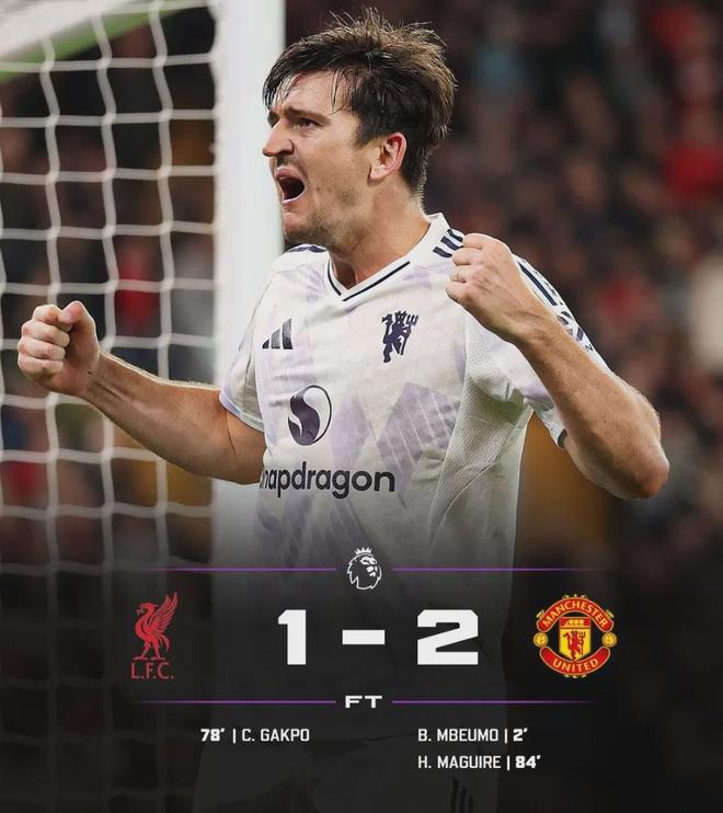 2025年10月20日 4连败+落后榜首4分!利物浦1-2曼联 姆伯莫闪击马奎尔制胜