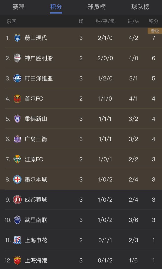 亚冠精英联赛最新积分榜:蓉城0-2排第8,海港0-2垫底,蔚山升第1