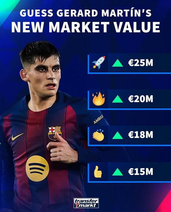 北京时间12月11日,在即将更新西甲球员身价的情况下,德转预热了巴塞罗那左后卫赫拉德-马丁的身价,并给出了四个上涨选项,最高为2500万欧元,最低为1500万欧元。
