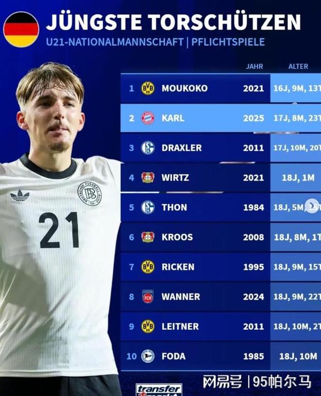 这不是卡尔第一次抢流量。10月欧冠拜仁对阵布鲁日,他以17岁242天的年龄成为拜仁欧冠队史最年轻进球球员;11月德甲对阵弗赖堡,他以17岁273天的年龄,成为拜仁队史德甲单场传射建功最年轻的球。
